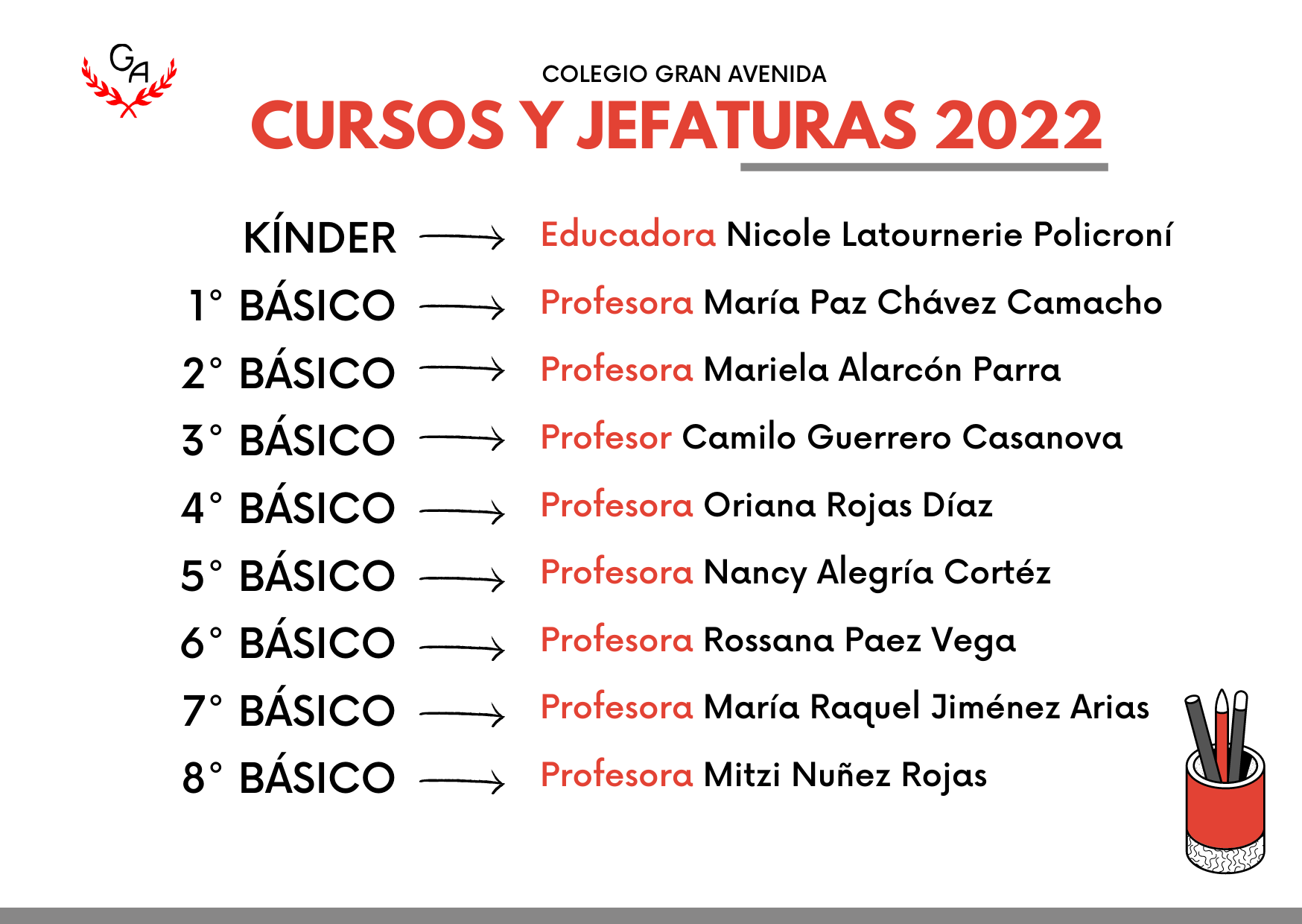 Cursos y Jefaturas 2022 Se da a conocer el listado de los cursos y sus respectivas jefaturas para este año escolar 2022. DESCARGAR INFORMACION Enviar comentario Cancelar la respuestaTu dirección de correo electrónico no será publicada. Los campos obligatorios están marcados con *Comentario * Nombre * Correo electrónico * Web Guarda mi nombre, correo electrónico y web en este navegador para la próxima vez que comente.